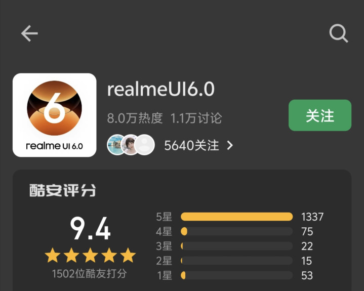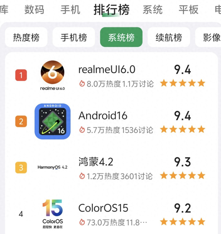 首先第一名就有点让人意想不到,不是“安卓之光”ColorOS15,也不是国产自研的鸿蒙NEXT,而是真我的手机系统,realme UI 6.0,1500人打出了9.4的高分。其实真我的手机系统本质上和OPPO的ColorOS15区别不大,基本上OPPO有的功能,真我也都有。
